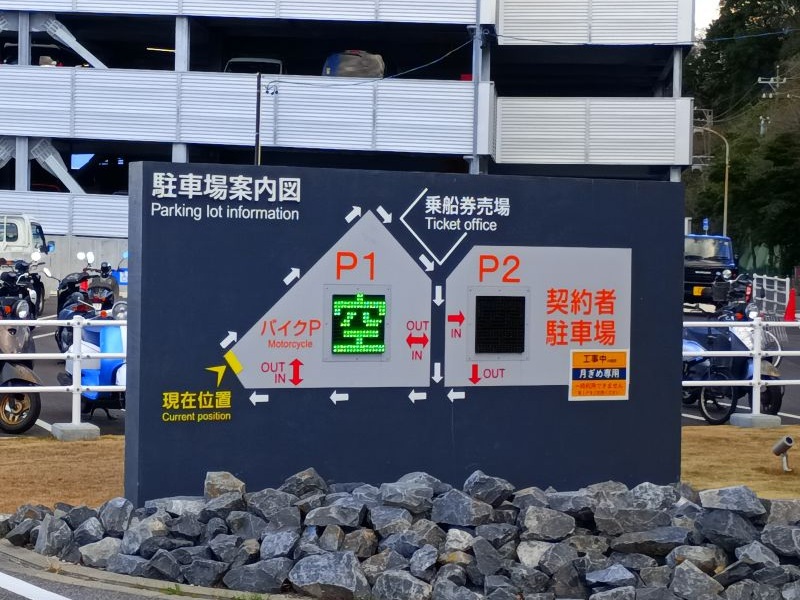 まず、安全な場所に車を停め、観光センター内にある乗船券売場で「ご予約名・あつ美やマリンパークホテルご利用の旨」を伝え、駐車カード保証金1000円を預けて立体駐車場の駐車カードをお受け取りください ※先に駐車カードをもらわないと入場できません ※カード保証金1000円はお帰りの際、駐車券返却のときお返しします |